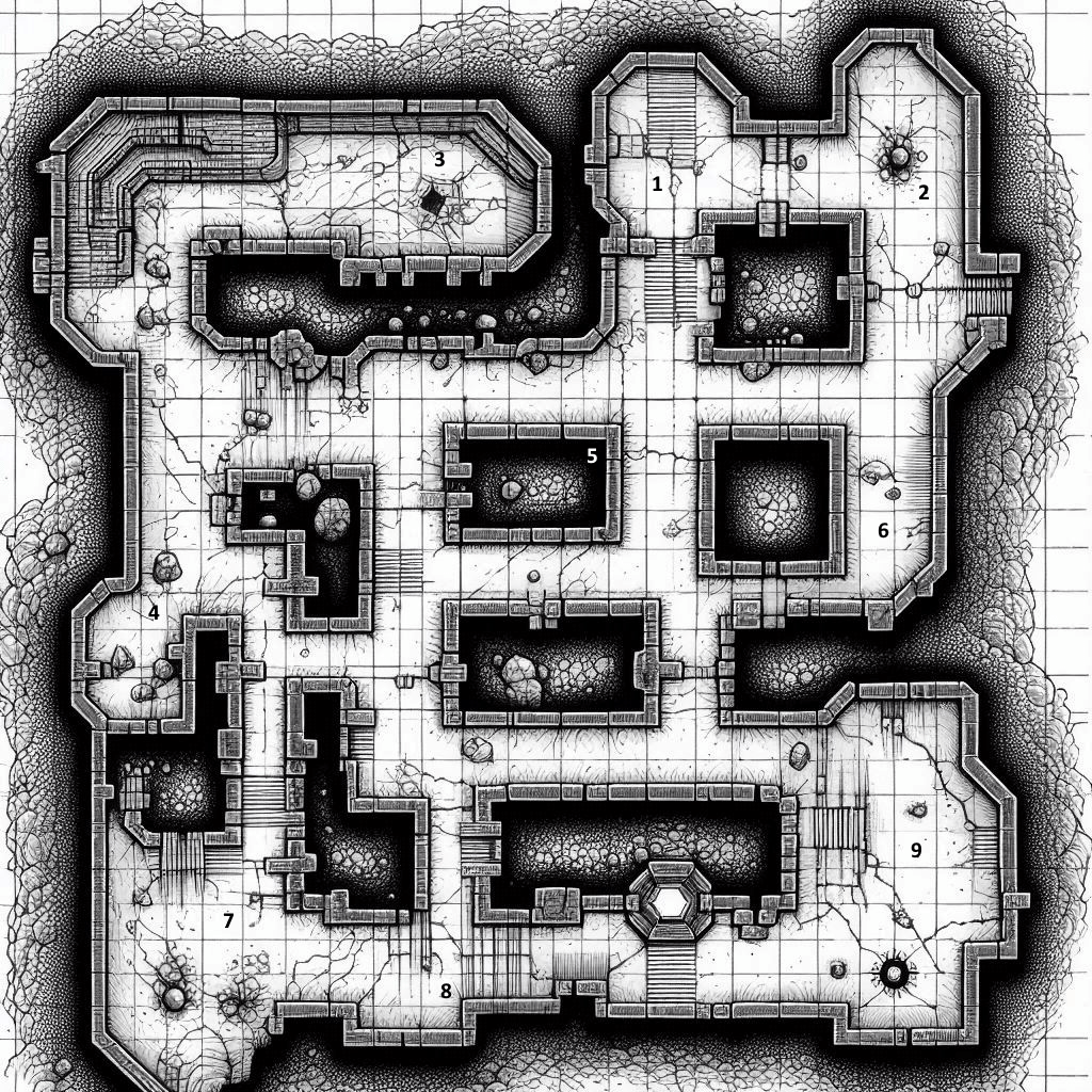 This narrow passage was a hidden escape route. It is mostly collapsed, but a small crawlspace remains navigable. It leads to Room 7 and provides an alternative route to bypass some of the dangers of the sanctum. Crawling through the tunnel requires a successful Athletics check (DC 10) to avoid getting stuck or injured. - Central Chamber (Bottom-Right):